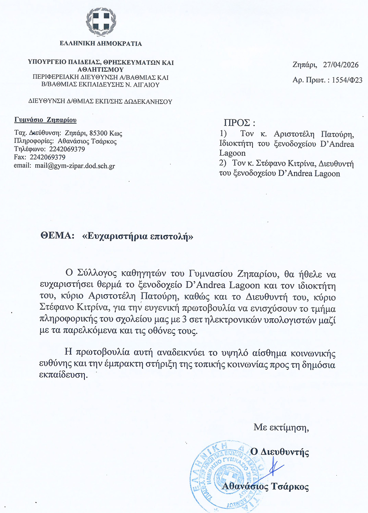 Συγχαρητήρια του Α.Σ. Φοίβος Κω