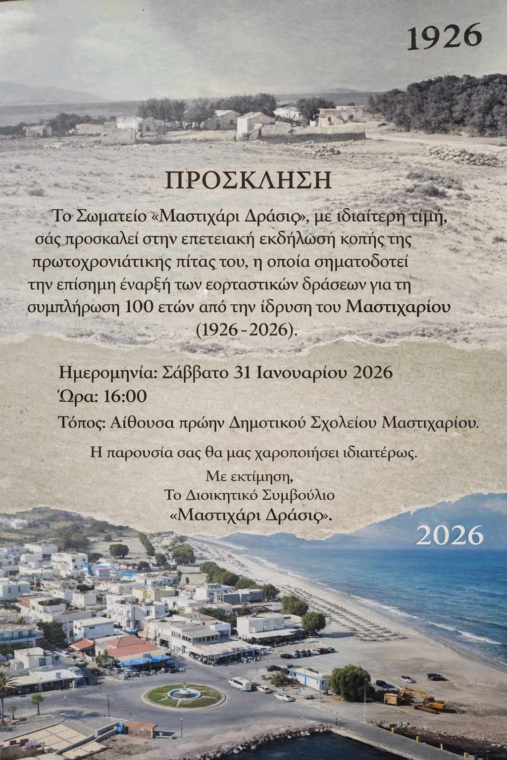 "Μαστιχάρι Δράσις": Επετειακή εκδήλωση κοπής πίτας στις 31/1