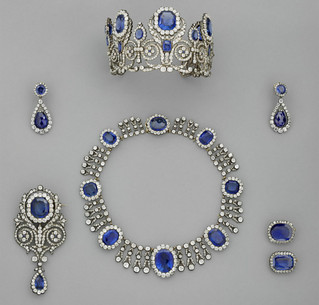 Μια τιάρα, ένα κολιέ και ένα μονό σκουλαρίκι από το σετ με ζαφείρια που ανήκε στη βασίλισσα Μαρία-Αμαλία και στη βασίλισσα Ορτάνς.