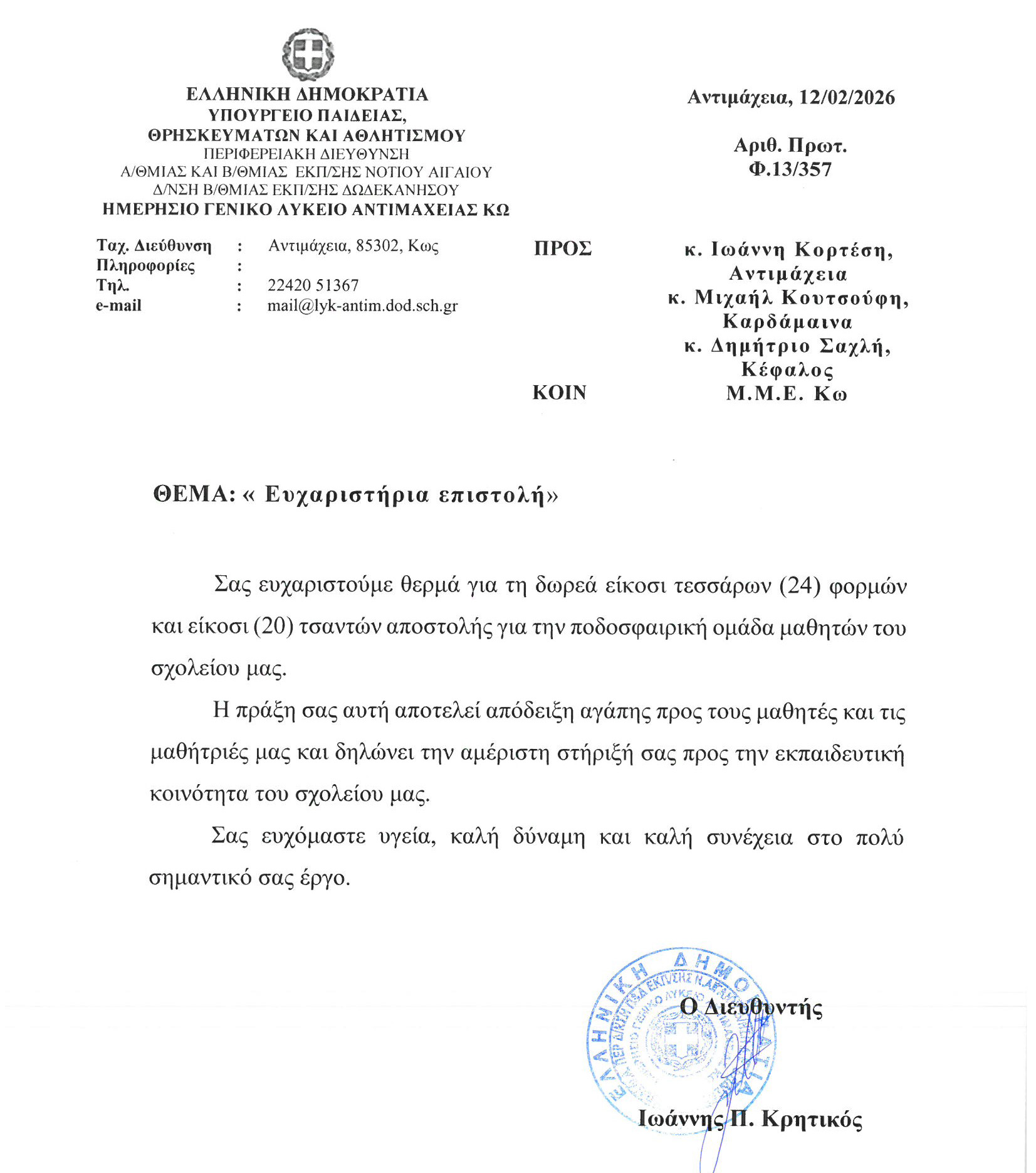 Ευχαριστήριο του Λυκείου Αντιμάχειας για την προσφορά φορμών και τσαντών αποστολής στην ποδοσφαιρική ομάδα