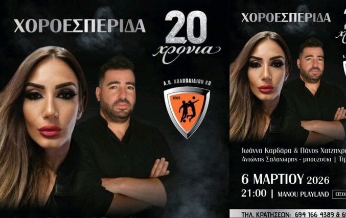 Ο Α.Ο. Αθλοπαιδιών Κω γιορτάζει φέτος 20 χρόνια παρουσίας στον αθλητισμό και προσκαλεί όλους τους φίλους του συλλόγου σε μια ξεχωριστή χοροεσπερίδα, την Παρασκευή 6 Μαρτίου 2026 στις 21:00, στο Manou Playland.