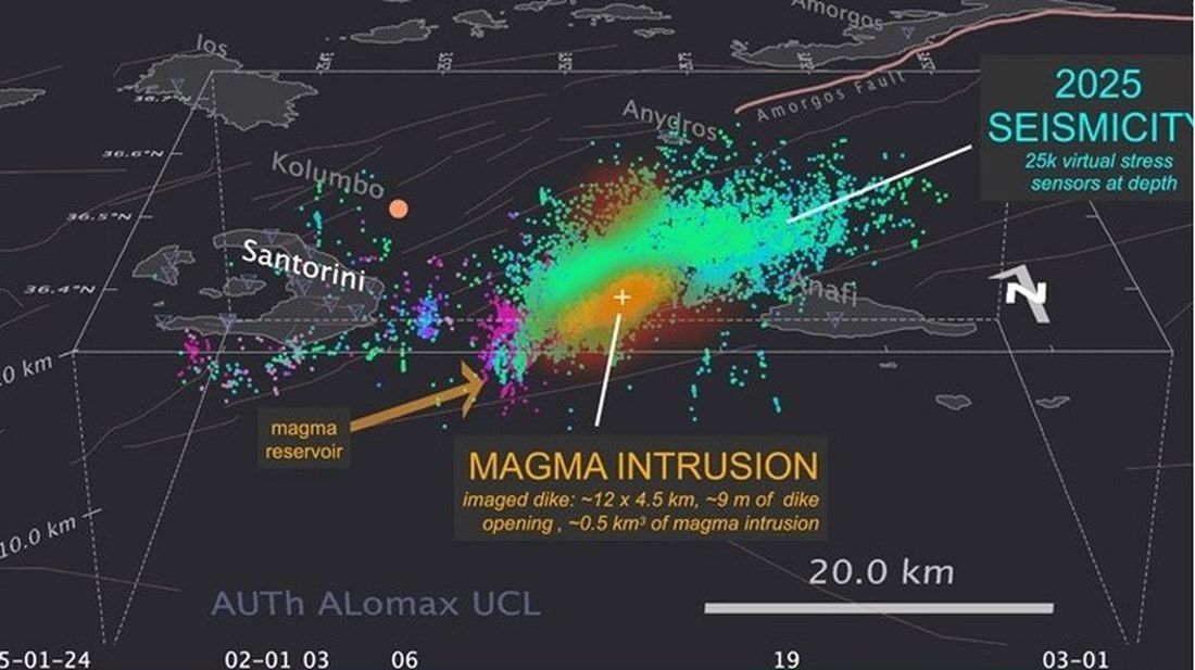 Διεθνής ομάδα ερευνητών, ανάμεσα τους και Έλληνες, αποκάλυψε τις κρυφές διεργασίες που οδήγησαν στην ιδιαίτερα ενεργή σεισμική δραστηριότητα κοντά στη Σαντορίνη στις αρχές του 2025. Η μελέτη τους, που δημοσιεύτηκε στο περιοδικό Science, δείχνει ότι η δραστηριότητα προκλήθηκε από μια τεράστια μαγματική διείσδυση - ένα κατακόρυφο στρώμα μάγματος - που διαδόθηκε κατά κύματα σε απόσταση μεγαλύτερη από 20 χιλιόμετρα μέσα στο φλοιό της Γης σε βάθος μεγαλύτερο από 10 χιλιόμετρα κάτω από τον πυθμένα της θάλασσας.