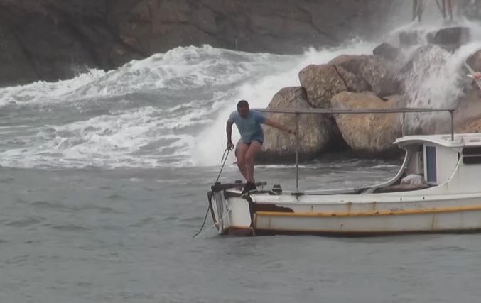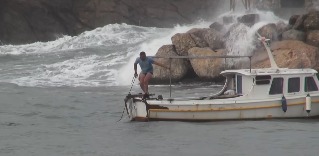 Ο ψαράς, παρά την εμφανή πίεση της στιγμής, καταφέρνει να δέσει το καΐκι του σε πιο προστατευμένο σημείο, επιχειρώντας να αποτρέψει τη βύθισή του. Η ένταση είναι διάχυτη, καθώς τα κύματα σκεπάζουν σχεδόν το σκάφος και απειλούν να το παρασύρουν.