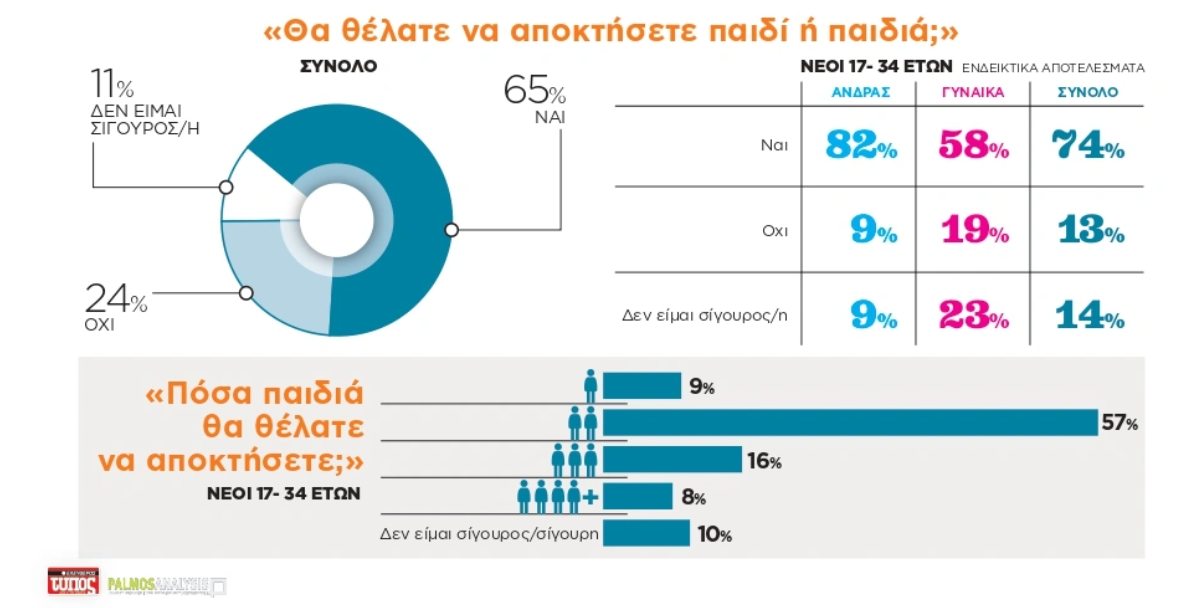 Το νέοι άνδρες δηλώνουν κατά 82% ότι θέλουν να αποκτήσουν παιδιά, ενώ οι νέες γυναίκες είναι πολύ πιο επιφυλακτικές σε ποσοστό 58%.