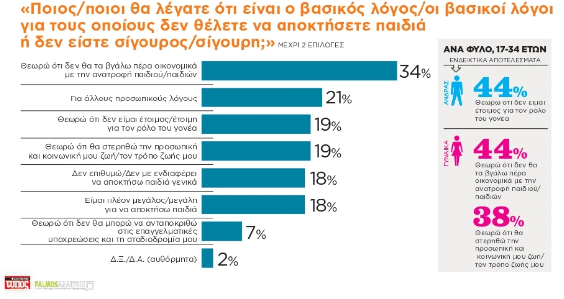 Παρότι το 65% των νέων έως 34 ετών δηλώνουν πως θέλουν να αποκτήσουν παιδιά, το ποσοστό του «όχι» είναι διπλάσιο στις γυναίκες απ' ότι στους άνδρες. Συγκεκριμένα το 42% των γυναικών αναπαραγωγικής ηλικίας δεν επιθυμούν να γίνουν μητέρες ή δεν είναι σίγουρες ότι το θέλουν, όταν το αντίστοιχο ποσοστό στους άνδρες είναι μόλις 18%.