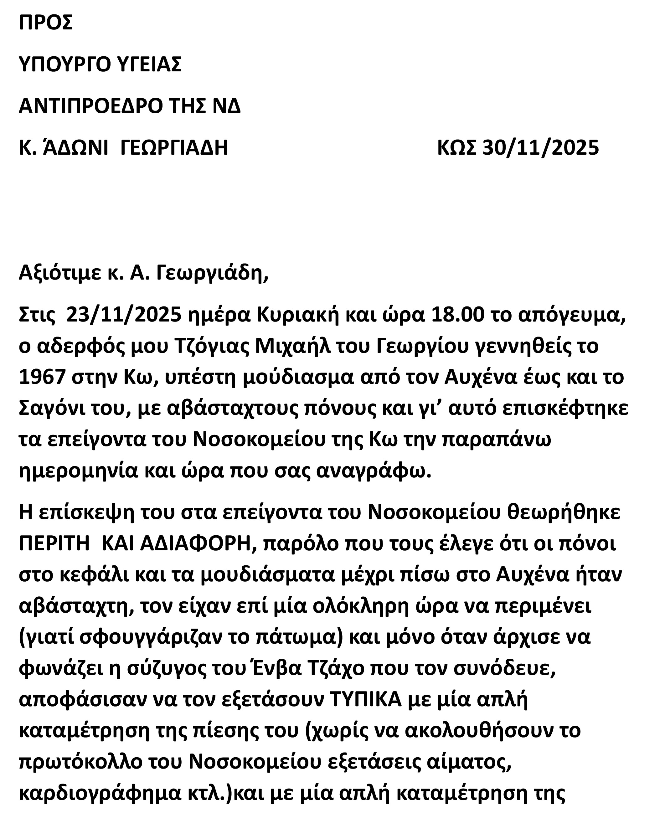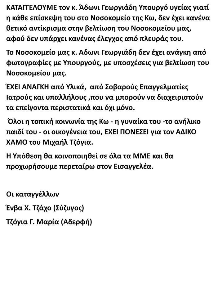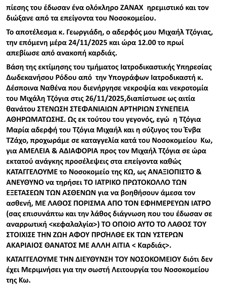 Καταγγελία της οικογένειας του εκλιπόντος Μ. Τζόγια για αμέλεια και αδιαφορία προς το νοσοκομείο Κω και τον Υπ. Υγείας Α. Γεωργιάδη