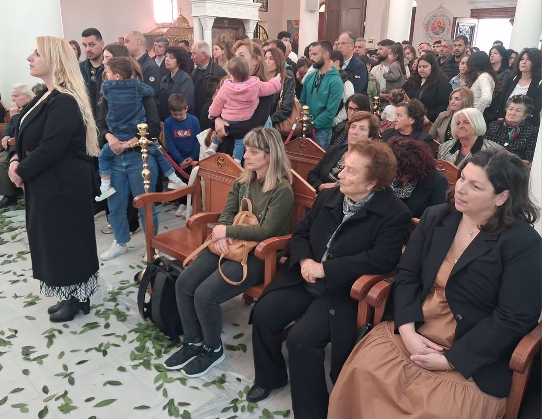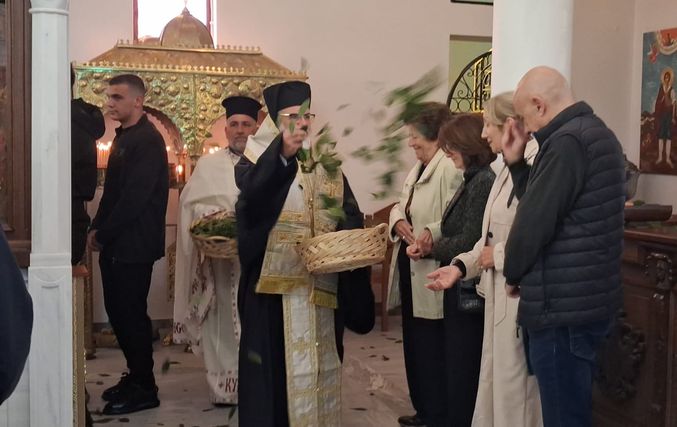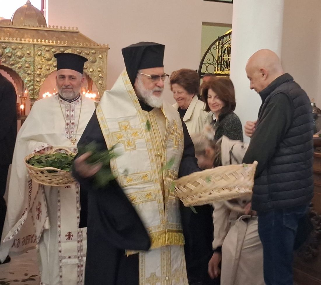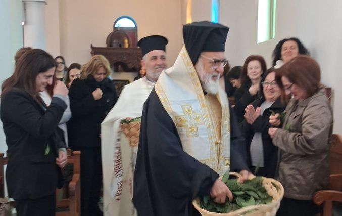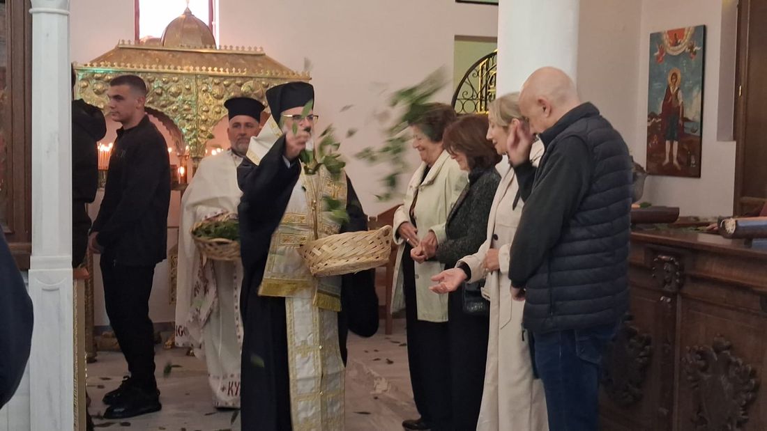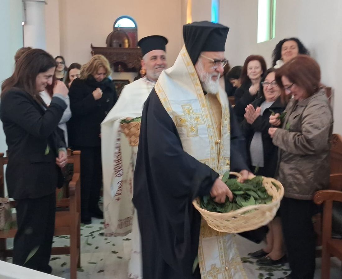 Ταυτόχρονα, ο Σεβασμιώτατος Μητροπολίτης έραινε τους πιστούς με φύλλα δάφνης, μια πράξη βαθιά συμβολική, που παραπέμπει στη νίκη, την ελπίδα και την αναγέννηση. Τα φύλλα δάφνης, σκορπισμένα στον ναό, ενίσχυαν το μήνυμα της χαράς και της λύτρωσης, μεταδίδοντας στους παρευρισκόμενους το αίσθημα της θείας ευλογίας.