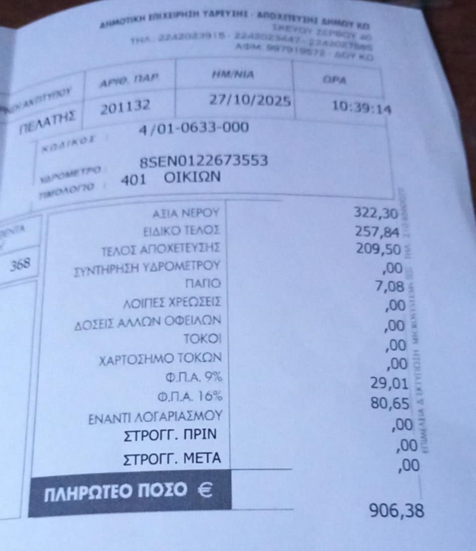 «Έπαθα σοκ – είπε- όταν είδα τον λογαριασμό του νερού να ξεπερνάει τα 900 ευρώ. Πήγαινα να πληρώσω στην κοινότητα και μου έλεγαν ότι δεν υπάρχει υπάλληλος να με εξυπηρετήσει, καθώς βγήκε στην σύνταξη. Αυτό γινόταν από τον Φεβρουάριο του 2025. Τελικά συσσωρεύτηκαν οι λογαριασμοί, και μαζί ανέβηκε και ο ΦΠΑ με αποτέλεσμα να μου φτάσει το υπόλοιπο τα 906 ευρώ. Μέσα σε ένα λογαριασμό είδα το ειδικό τέλος που γράφει πάνω στους λογαριασμούς να έρχεται περίπου στα 250 ευρώ, όταν ερχόταν κάτω από 10 ευρώ και το τέλος αποχέτευσης στα 210 ευρώ όταν ερχόταν 8,5 ευρώ.