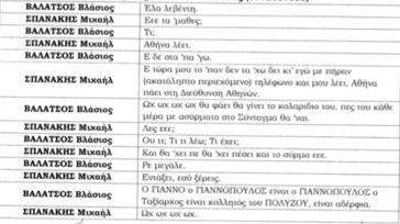 Στο πλαίσιο της αστυνομικής έρευνας – προκαταρκτικής εξέτασης που διερευνήθηκε για τον έλεγχο και την αξιολόγηση των καταγγελιών αυτών, μεταξύ των άλλων ανακριτικών πράξεων, διατάχθηκε και η άρση του απορρήτου των τηλεφωνικών συνδιαλέξεων διαφόρων προσώπων, από την οποία (άρση του απορρήτου) προέκυψαν διάφορες συνομιλίες μεταξύ των οποίων και οι ακόλουθοι διάλογοι που έλαβαν χώρα μεταξύ των ακόλουθων προσώπων:
