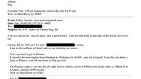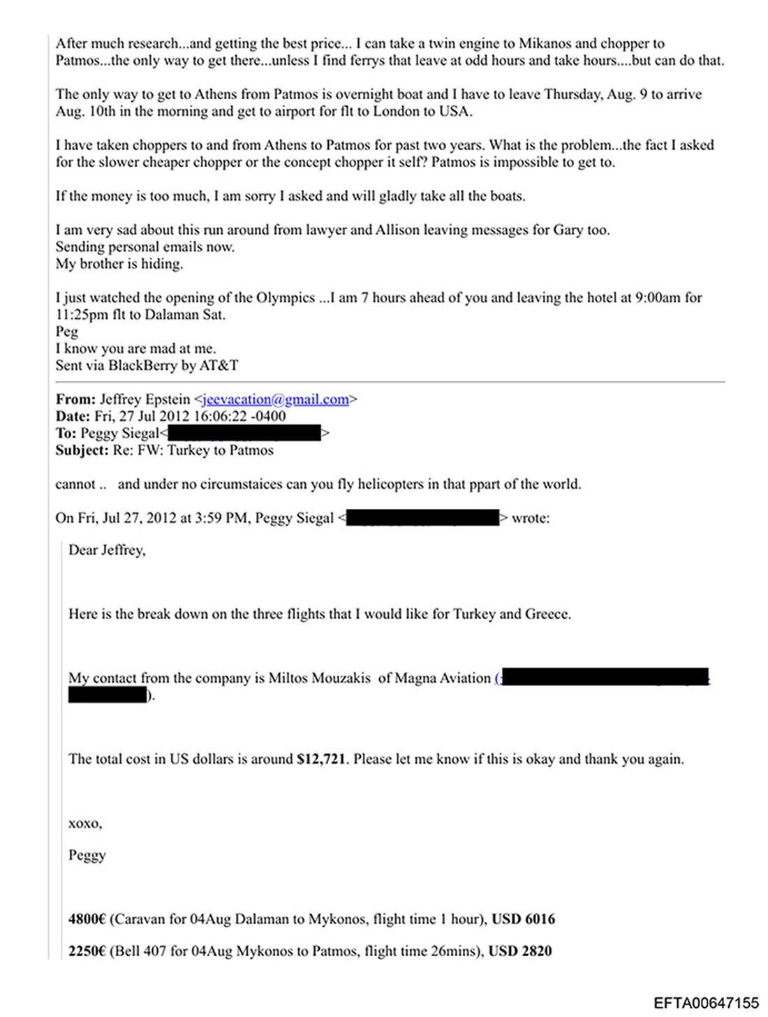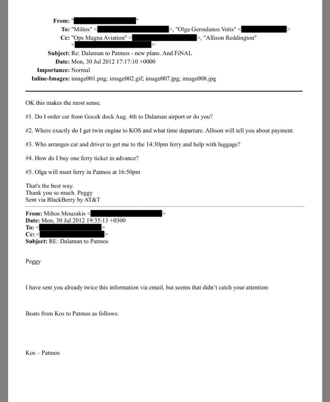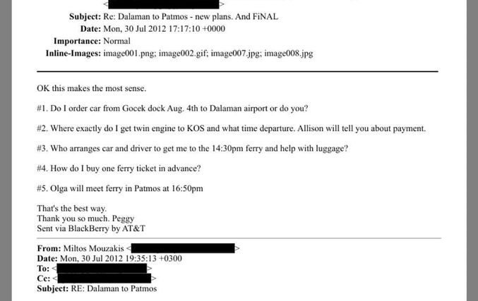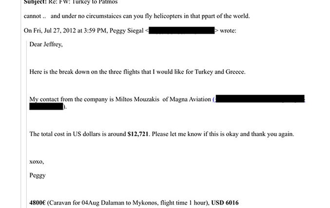 Στα δημοσιευμένα emails, τα οποία πλέον αποτελούν δημόσια έγγραφα, υπάρχουν αναφορές σε θερινές διακοπές σε Ελλάδα και Τουρκία. Η Siegal εμφανίζεται να συντονίζει τα διαδικαστικά του ταξιδιού, επικοινωνώντας με ταξιδιωτικούς πράκτορες για τη μετάβαση της ίδιας και της παρέας της σε Κω και Πάτμο. Στην αλληλογραφία καταγράφονται πληροφορίες για αεροπορικά και ακτοπλοϊκά δρομολόγια, ιδιωτικά σκάφη αλλά και ελικόπτερα, με όλη την επικοινωνία να γίνεται μέσω των τότε δημοφιλών κινητών Blackberry.