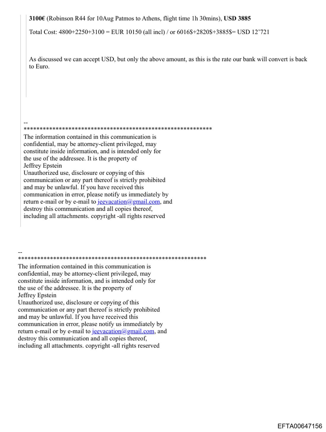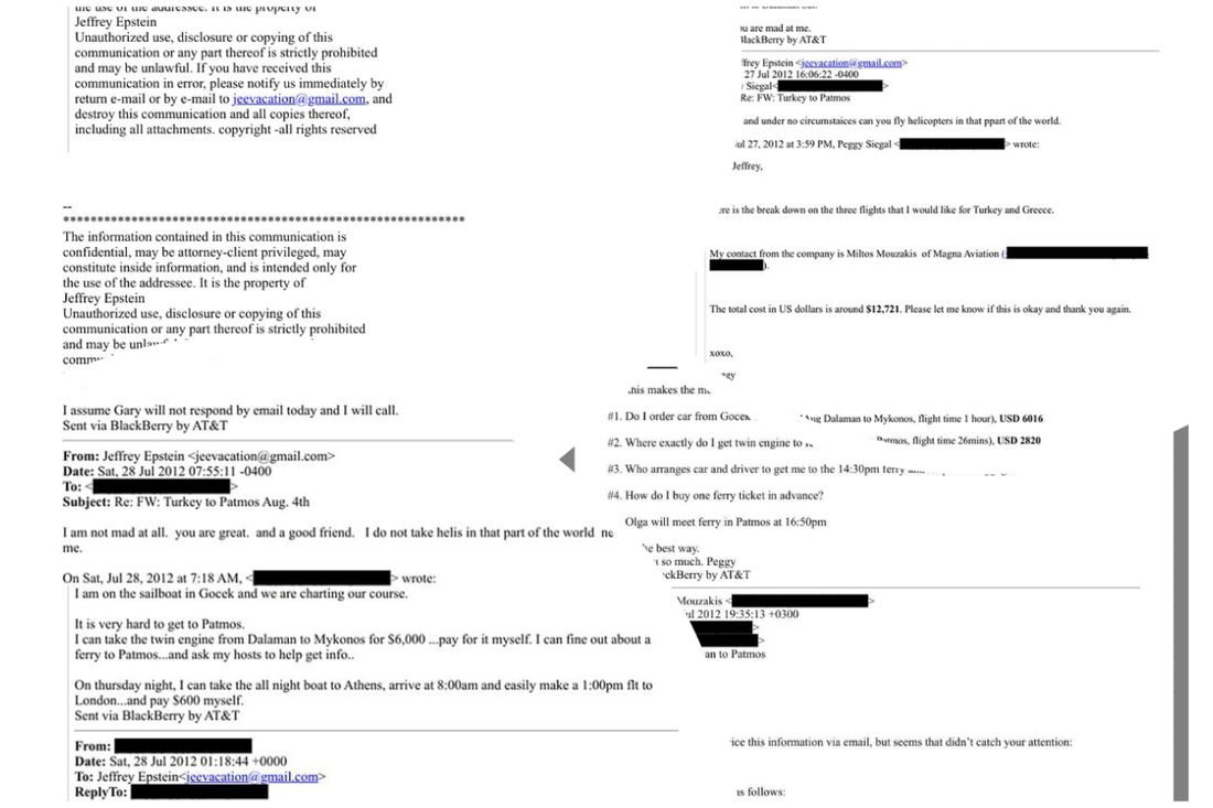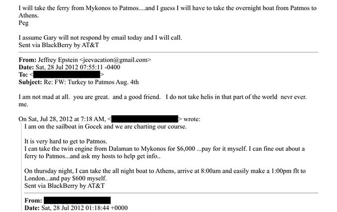Δεν προκύπτει με σαφήνεια εάν ο Jeffrey Epstein συμμετείχε τελικά στο συγκεκριμένο ταξίδι. Σε μία συνομιλία ωστόσο φέρεται να σχολιάζει για τη μετακίνηση από τη Μύκονο προς την Πάτμο: