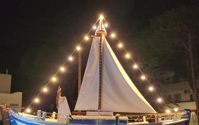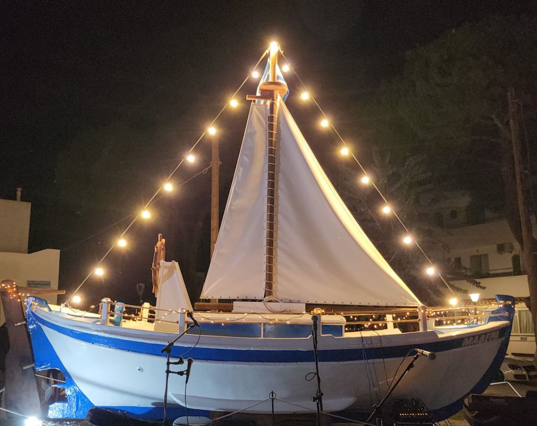 Το τρεχαντήρι, ένα εμβληματικό στοιχείο της ναυτικής κληρονομιάς του νησιού, ανακατασκευάστηκε με ιδιαίτερη φροντίδα και πλέον στολίζει το σημείο, φωτισμένο και έτοιμο να υποδεχθεί την εορταστική περίοδο.