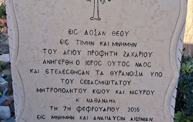 Χοροστατούντος του Σεβασμιωτάτου Μητροπολίτου Κώου και Νισύρου κ. Ναθαναήλ εψάλη το απόγευμα του Σαββάτου, ο εσπερινός της εορτής του Προφήτου Ζαχαρία του Μικρού, στην περιοχή του Αγ. Βασιλείου (στη διασταύρωση προς Οσία Μελώ δεξιά) στο φερώνυμο Ιερό Εξωκκλήσιο της οικογένειας Ιωάννου Φραντζή, το οποίο είναι αφιερωμένο στην μνήμη Ζαχαρία Γερασκλή.