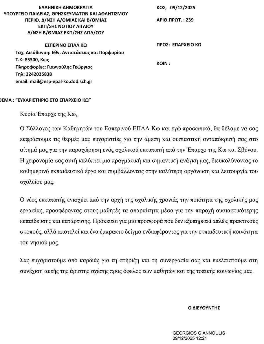 Ευχαριστήριo του εσπερινού ΕΠΑΛ Κω στην Έπαρχο Ν. Σβύνου για την παραχώρηση σχολικού εκτυπωτή