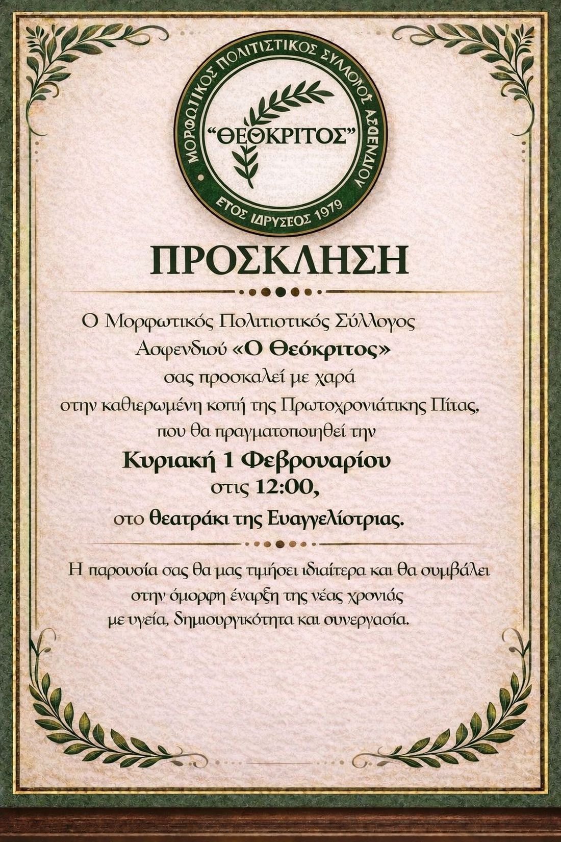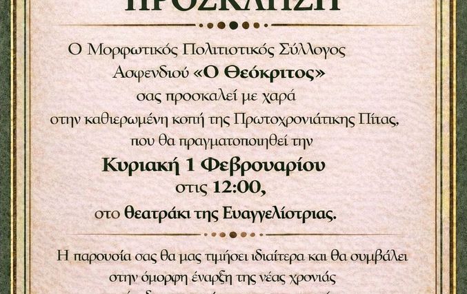 Ο Μορφωτικός Πολιτιστικός Σύλλογος Ασφενδιού «Ο Θεόκριτος» σας προσκαλεί στην κοπή της Πρωτοχρονιάτικης πίτας που θα πραγματοποιηθεί την Κυριακή 1 Φεβρουαρίου 2026, στις 12:00, στο Θεατράκι της Ευαγγελίστριας.