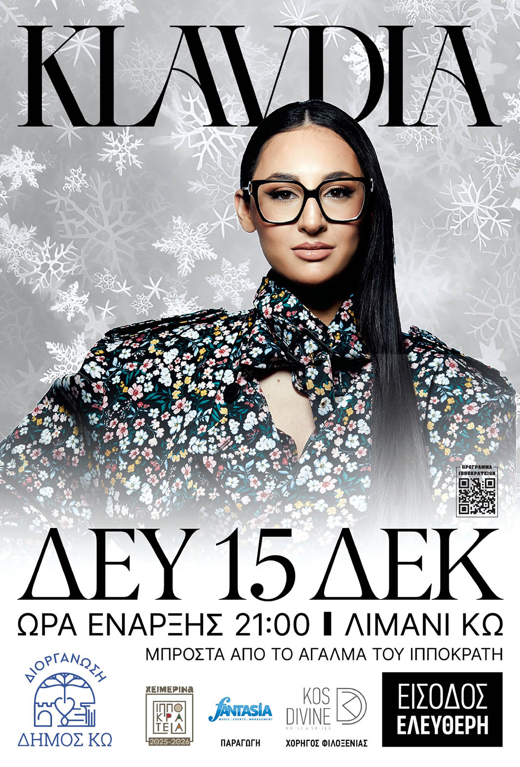 Μετά τη θριαμβευτική της εμφάνιση στη Eurovision, η Klavdia ταξιδεύει για να γοητεύσει το κοινό στην Κω! Η αγαπημένη τραγουδίστρια θα δώσει μια αξέχαστη συναυλία με ελεύθερη είσοδο τη Δευτέρα 15 Δεκεμβρίου, στο Λιμάνι (επί της Ακτής Κουντουριώτη), μπροστά από το άγαλμα του Ιπποκράτη στο πλαίσιο των πολιτιστικών εκδηλώσεων «Χειμερινά Ιπποκράτεια 2025-26».