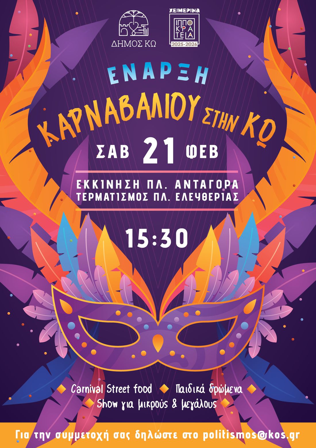 Το Τμήμα Πολιτισμού του Δήμου Κω προσκαλεί τους Πολιτιστικούς Συλλόγους, τις Σχολές Χορού, τα Σχολεία, τα Αθλητικά Σωματεία, τους φορείς και όλους όσοι αγαπούν το γλέντι και τη χαρά της Αποκριάς, να συμμετάσχουν στο ΚΑΡΝΑΒΑΛΙ ΤΗΣ ΚΩ, που θα πραγματοποιηθεί το Σάββατο 21 Φεβρουαρίου 2026 με ώρα έναρξης 15:30. Η παρέλαση θα ξεκινήσει από την Πλατεία Ανταγόρα και θα καταλήξει στην Πλατεία Ελευθερίας, όπου θα συνεχιστεί η γιορτή με ατελείωτο κέφι, μουσική και χορό για μικρούς και μεγάλους καρναβαλιστές.