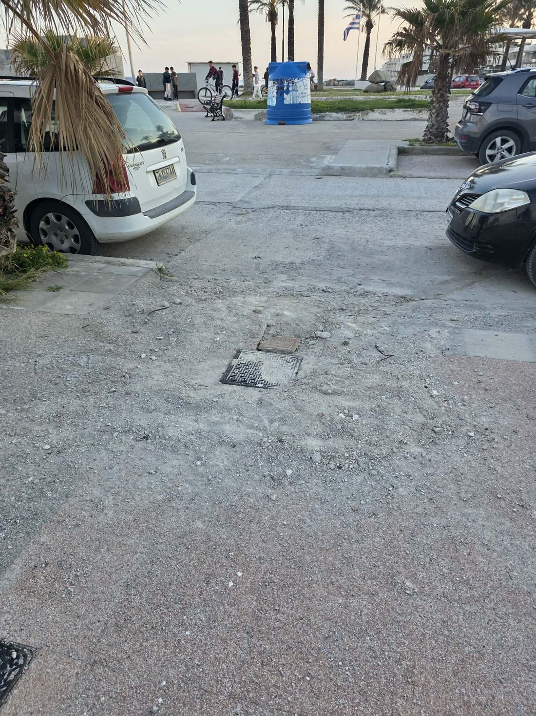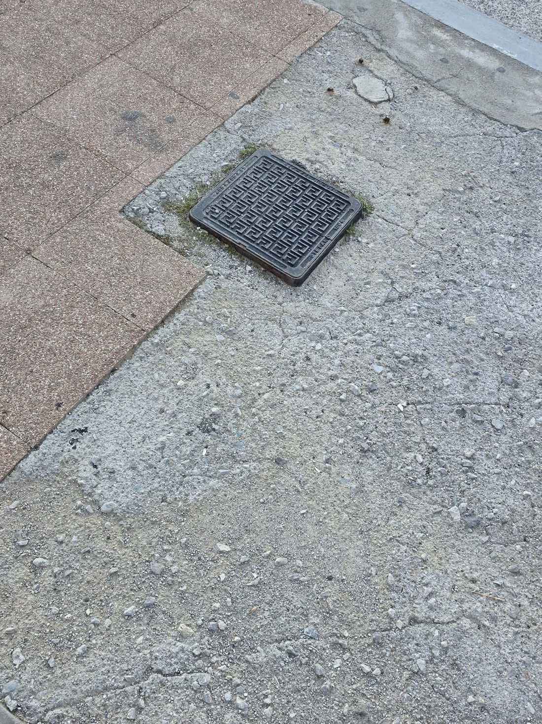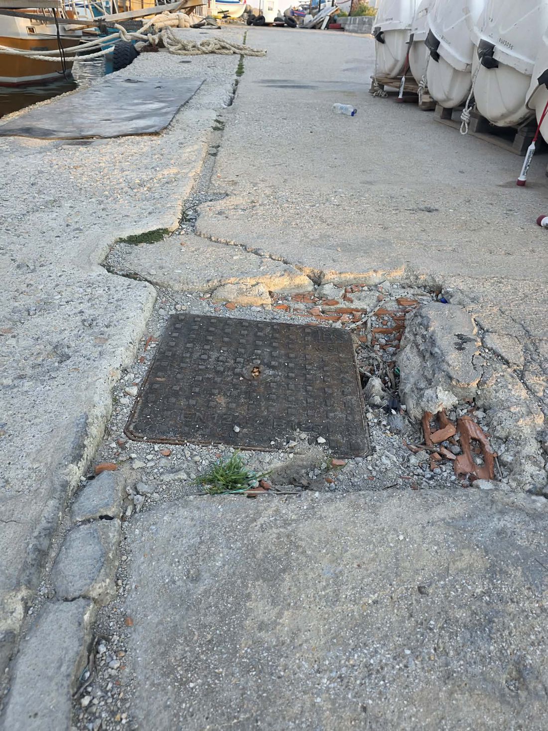Δεν ξέρω ποιος εχει κανει λάθος αλλα όλη η περιοχή εδω μοιάζει σαν να μην προσπάθησαν να το φέρουν στα ίσια ποτε ! Το καπάκι εξέχει τουλάχιστον 2.5 με 3 πόντους στην μια πλευρά με αποτέλεσμα να αποτελεί κίνδυνο για όσους περπατάνε στο λιμάνι και δεν κοιτανε μόνιμα κατω !