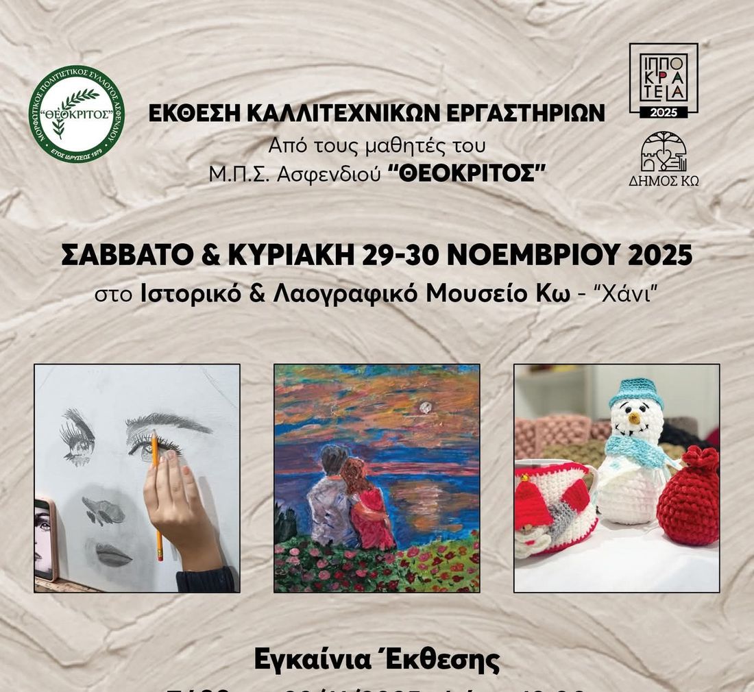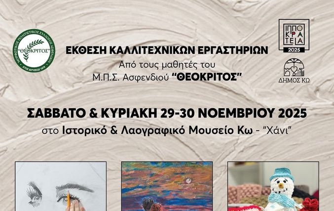 Οι μαθητές του Μουσικού & Πολιτιστικού Συλλόγου (Μ.Π.Σ.) Ασφενδιού "Θεόκριτος" παρουσιάζουν την Έκθεση Καλλιτεχνικών Εργαστηρίων τους, σε μια διοργάνωση που πραγματοποιείται υπό την αιγίδα του Δήμου Κω και των Ιπποκρατείων 2024.