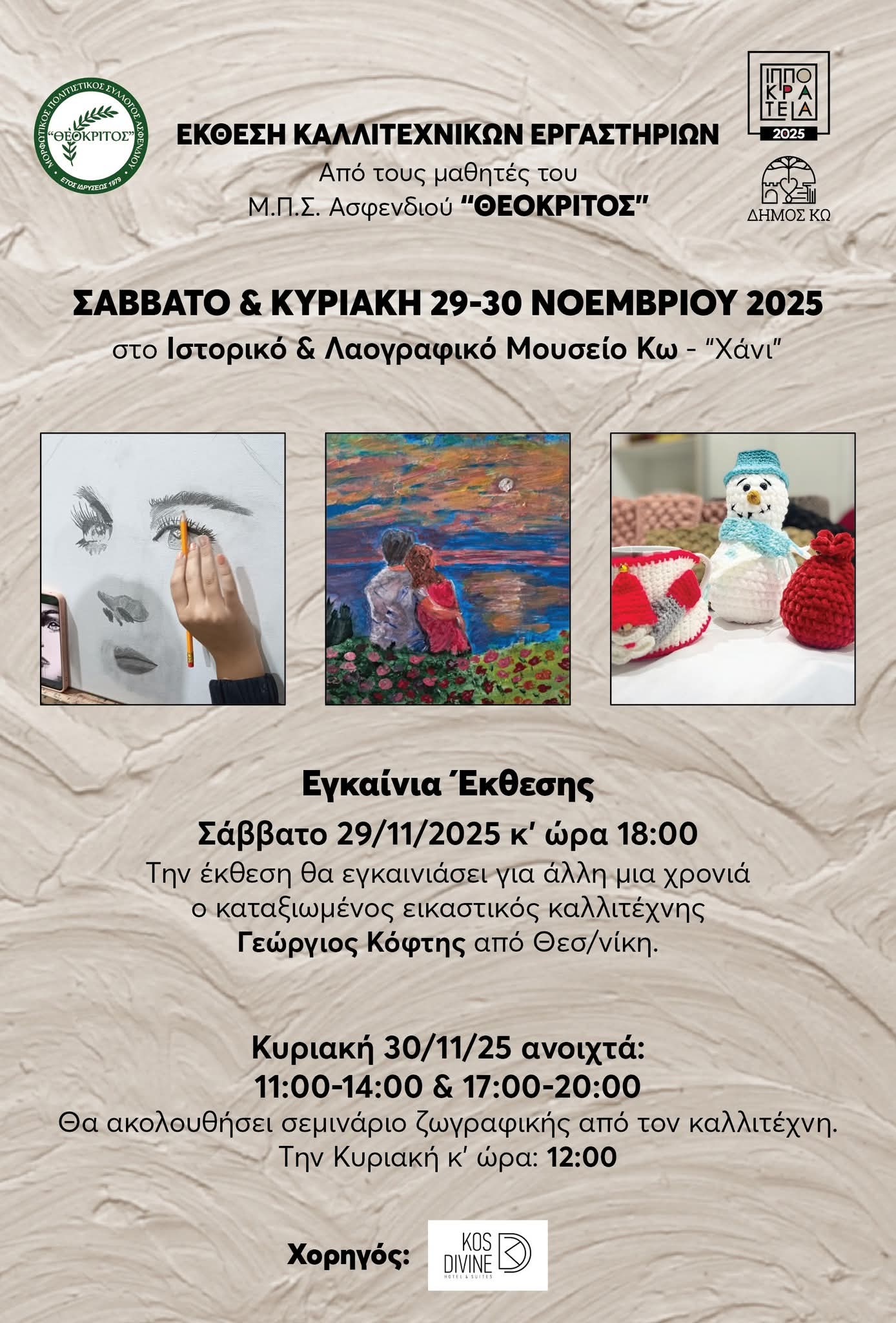 Μια ξεχωριστή καλλιτεχνική εκδήλωση ετοιμάζεται να φιλοξενήσει το Ιστορικό & Λαογραφικό Μουσείο Κω - "Χάνι", αυτό το Σαββατοκύριακο, 29 & 30 Νοεμβρίου 2025.