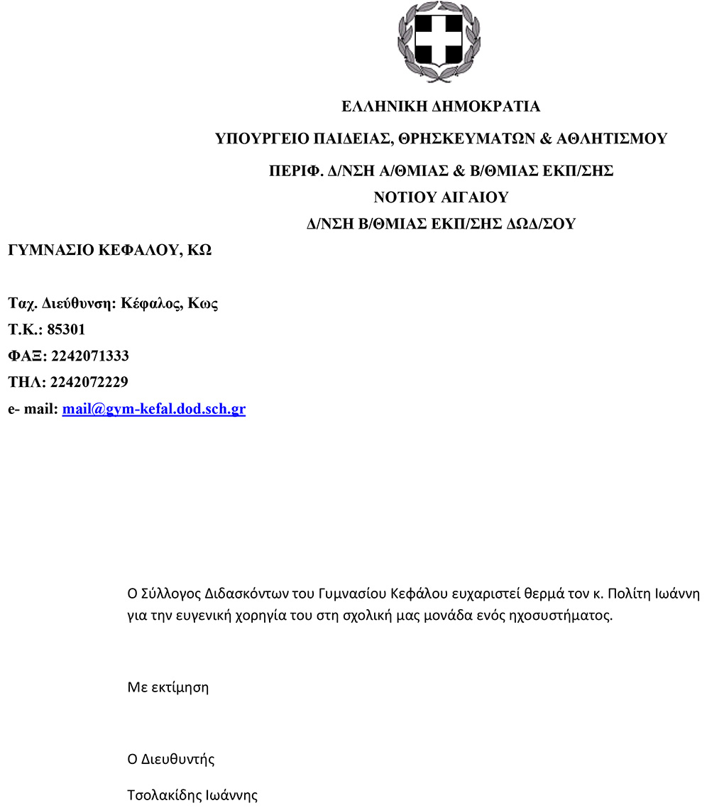 Ευχαριστήριο του Γυμνασίου Κεφάλου