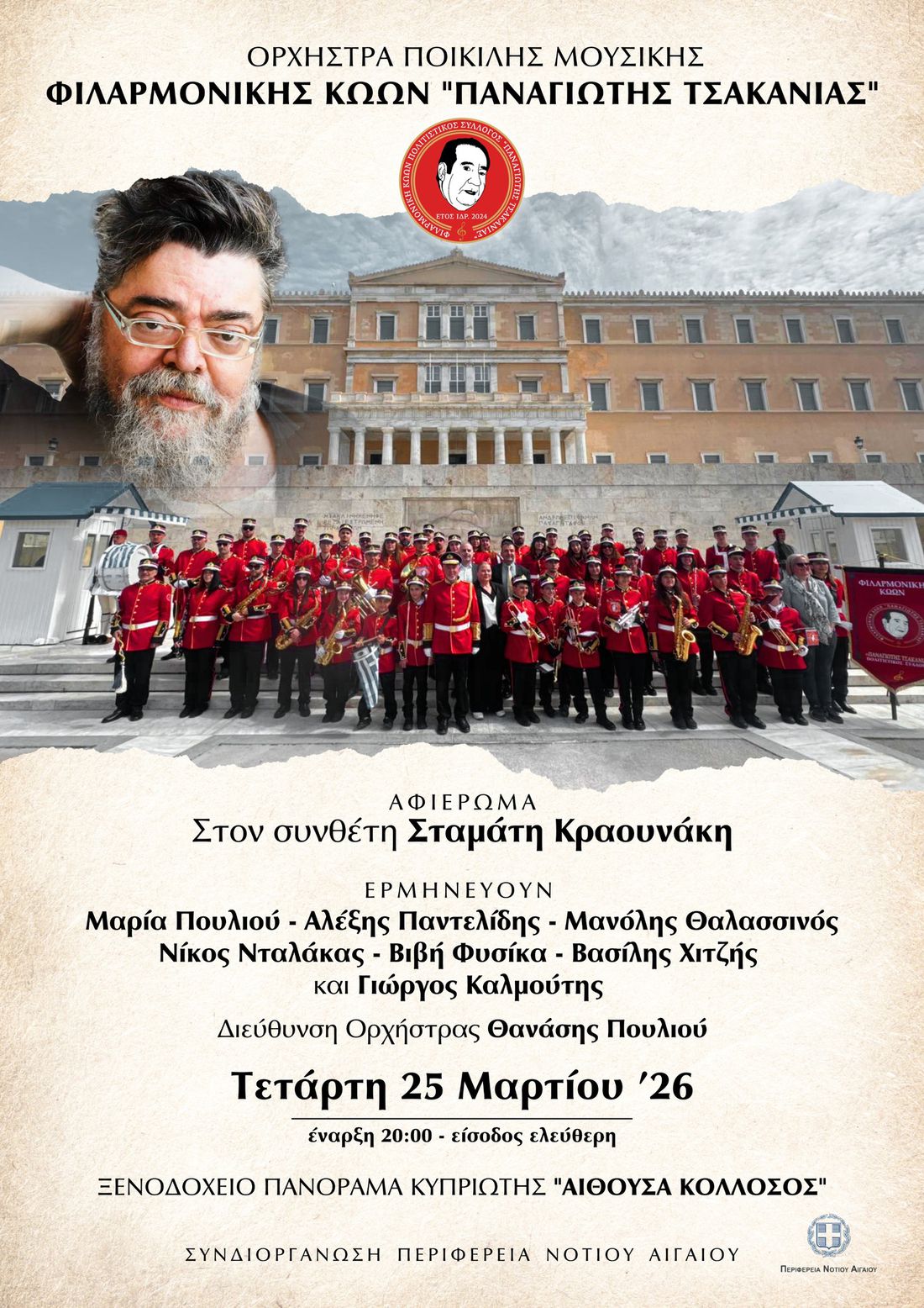 Σας προσκαλούμε στη 1η Συναυλία της Ορχήστρας Ποικίλης Μουσικής της Φιλαρμονικής Κώων ΄΄ΠΑΝΑΓΙΩΤΗΣ ΤΣΑΚΑΝΙΑΣ ΄΄σε ένα μουσικό αφιέρωμα στον μουσικοσυνθέτη Σταμάτη Κραουνάκη , την Τετάρτη 25 Μαρτίου 2026 και ώρα 20.00 στο Ξενοδοχείο Πανόραμα Κυπριώτης ,αίθουσα Κολοσσός .