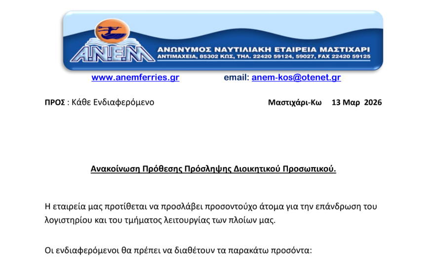 Την πρόθεσή της να ενισχύσει το ανθρώπινο δυναμικό της ανακοίνωσε η Ανώνυμη Ναυτιλιακή Εταιρεία Μαστιχαρίου (ΑΝΕΜ), προχωρώντας σε διαδικασία πρόσληψης διοικητικού προσωπικού για την κάλυψη αναγκών στο λογιστήριο και στο τμήμα λειτουργίας των πλοίων της.