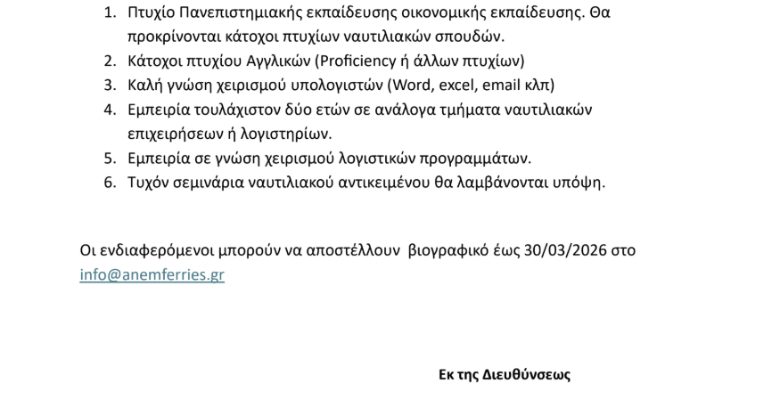 Οι ενδιαφερόμενοι καλούνται να υποβάλουν το βιογραφικό τους έως τις 30 Μαρτίου 2026, εφόσον διαθέτουν τα απαραίτητα ακαδημαϊκά και επαγγελματικά προσόντα που σχετίζονται με τον τομέα της οικονομικής και ναυτιλιακής διαχείρισης.