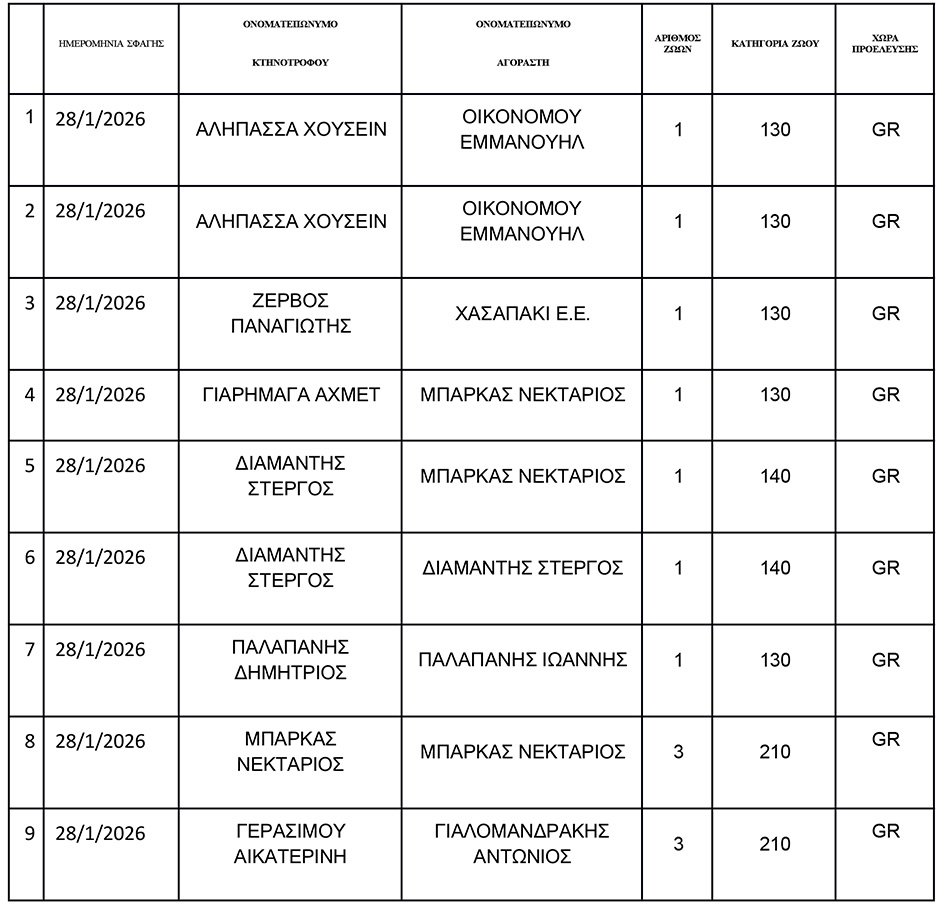 Σας αποστέλλουμε πίνακα όπου απεικονίζονται αναλυτικά οι σφαγές οι οποίες έλαβαν χώρα στο Δημοτικό Σφαγείο Κω την Τετάρτη 28/1/2026.