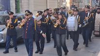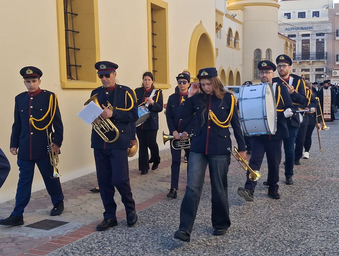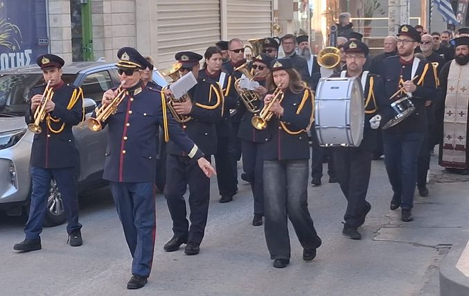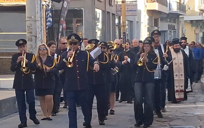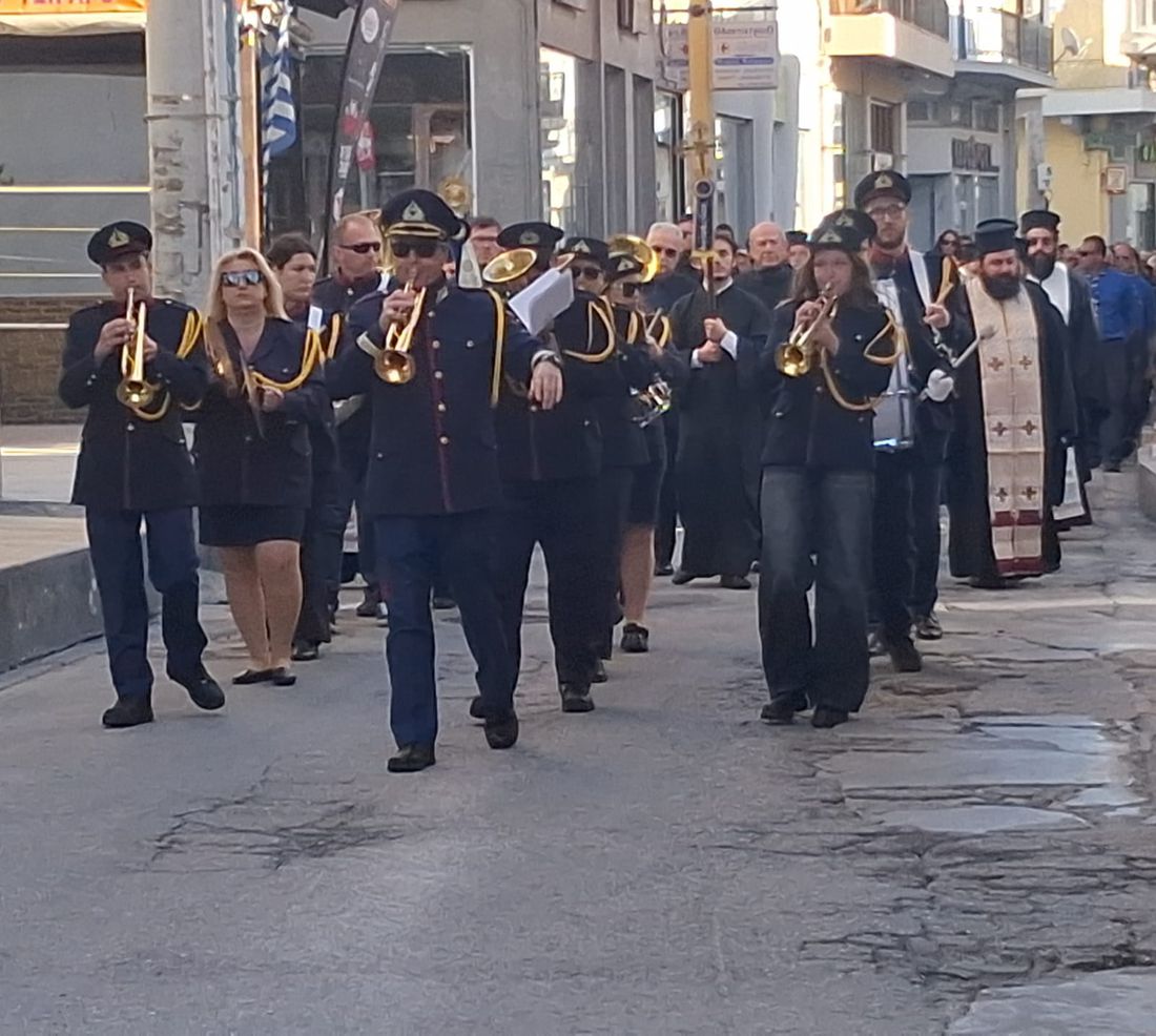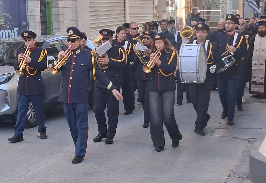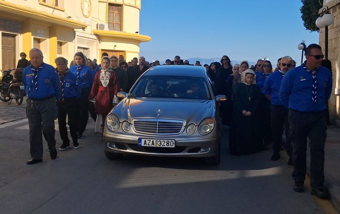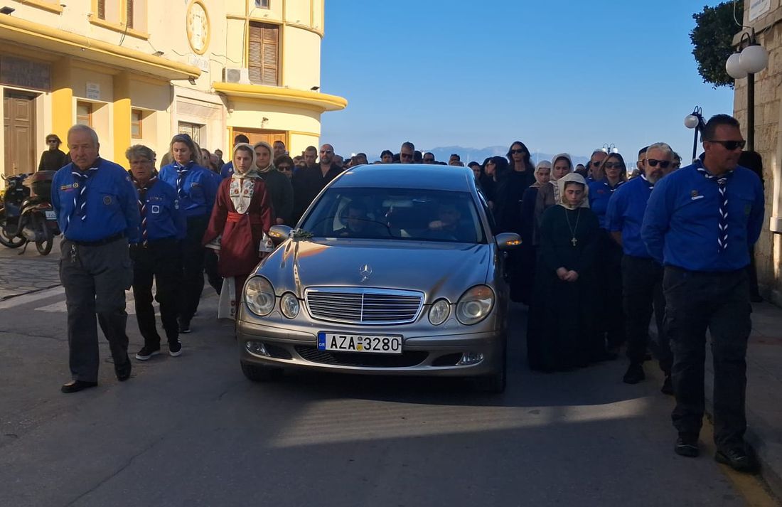 Μπροστά βρισκόταν Μοτοσικλετιστής αστυνομικός, και η δημοτική φιλαρμονική, ακολουθούμενη από ιερείς, ιεροψάλτες και τον Μητροπολίτη κ. Παίσιο και ακριβώς πίσω η νεκροφόρα που ήταν τοποθετημένο το φέρετρο περιστοιχισμένοι από προσκόπους και κοπέλλες του Λυκείου Ελληνίδων με παραδοσιακές στολές αποδίδοντας τιμές που αρμόζουν στην προσφορά και το έργο του εκλιπόντος.Ακολουθούσε η οικογένεια και πλήθος κόσμου.