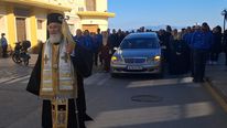 Λίγα λεπτά αργότερα, στις 14:45, τελέστηκε η εξόδιος ακολουθία σε ιδιαίτερα φορτισμένη ατμόσφαιρα, προεξάρχοντος του Σεβασμιοτάτου Μητροπολίτη Λέρου, Καλύμνου και Αστυπαλαίας κ. Παϊσίου, πλαισιωμένου από το σύνολο σχεδόν του ιερού κλήρου του νησιού, παρουσία της συζύγου του Καλλιόπη, των παιδιών του Αντώνη, Μιχάλη, Ελισάβετ, Αννίτα και Γιώργου, της αδελφής του Μαργαρίτας. Επίσης ανήψια, συγγενείς, φίλοι και στενοί συνεργάτες.