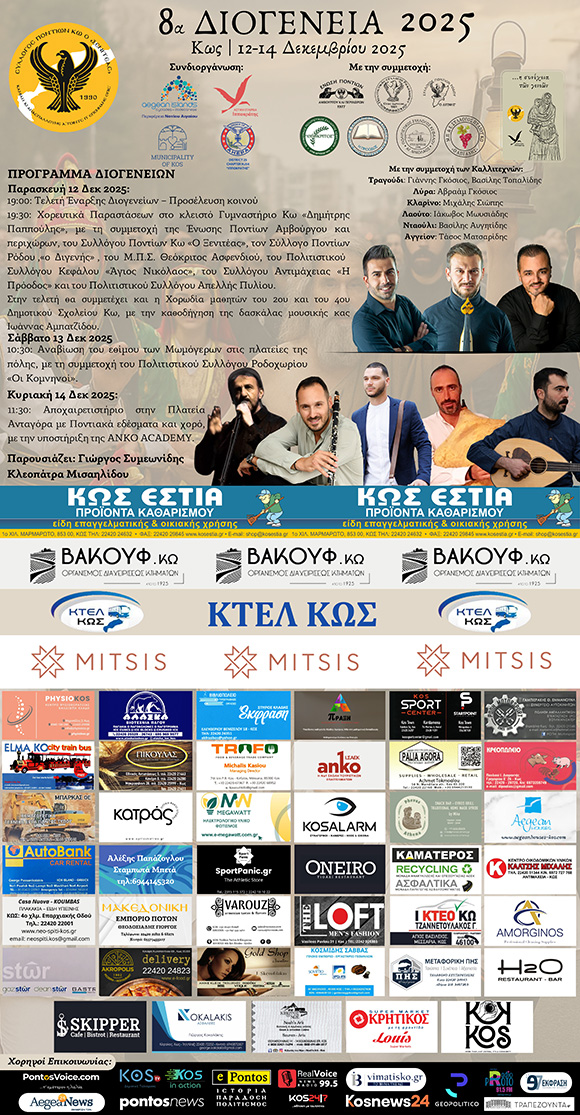 Ένα μεγάλο ευχαριστώ σε όλους τους χορηγούς που στηρίζουν έμπρακτα τη διοργάνωση και συμβάλλουν ώστε τα «Διογένεια» να μεγαλώνουν και να εξελίσσονται κάθε χρόνο. Ευχαριστούμε επίσης θερμά τους χορηγούς επικοινωνίας που προβάλλουν την προσπάθεια, μεταφέρουν το μήνυμα του Ποντιακού πολιτισμού από την Ιπποκρατική Κω και φέρνουν πιο κοντά την παράδοση σε κάθε σπίτι.