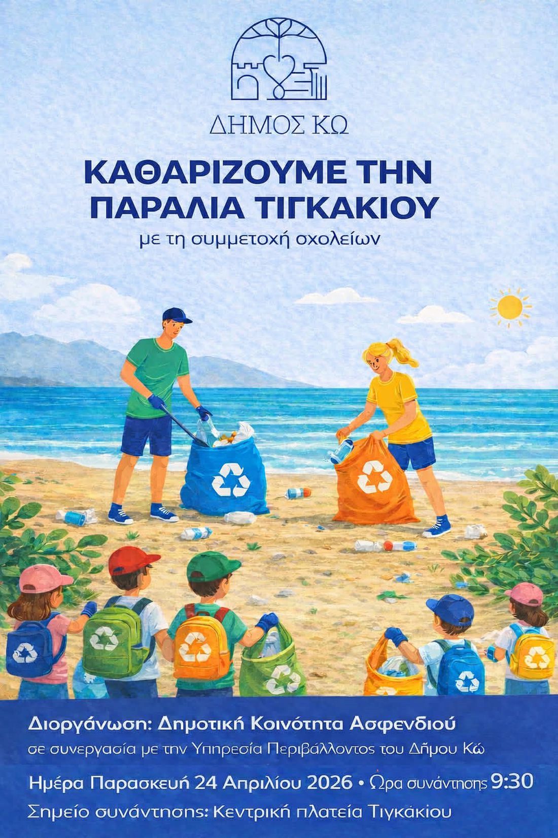 Η Δημοτική Κοινότητα Ασφενδιού σας προσκαλεί στην δράση καθαρισμού της παραλίας Τιγκακίου, η οποία διοργανώνεται με τη συμμετοχή σχολικών μονάδων της περιοχής και σε συνεργασία με την Υπηρεσία Περιβάλλοντος του Δήμου Κω.