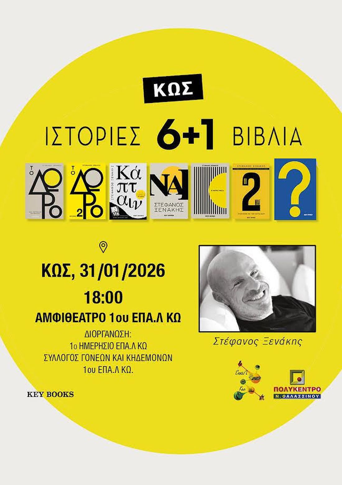 Το 1ο Ημερήσιο ΕΠΑ.Λ ΚΩ, ο Σύλλογος Γονέων και Κηδεμόνων 1ου ΕΠΑ.Λ ΚΩ, το Πολύκεντρο Ν. Θαλασσινού και η Key Books σας προσκαλούν στην παρουσίαση του Στέφανου Ξενάκη "ΙΣΤΟΡΙΕΣ 6+1 ΒΙΒΛΙΑ" το Σάββατο 31/01/2026 (ώρα 6)  στο Αμφιθέατρο 1ου ΕΠΑ.Λ ΚΩ.