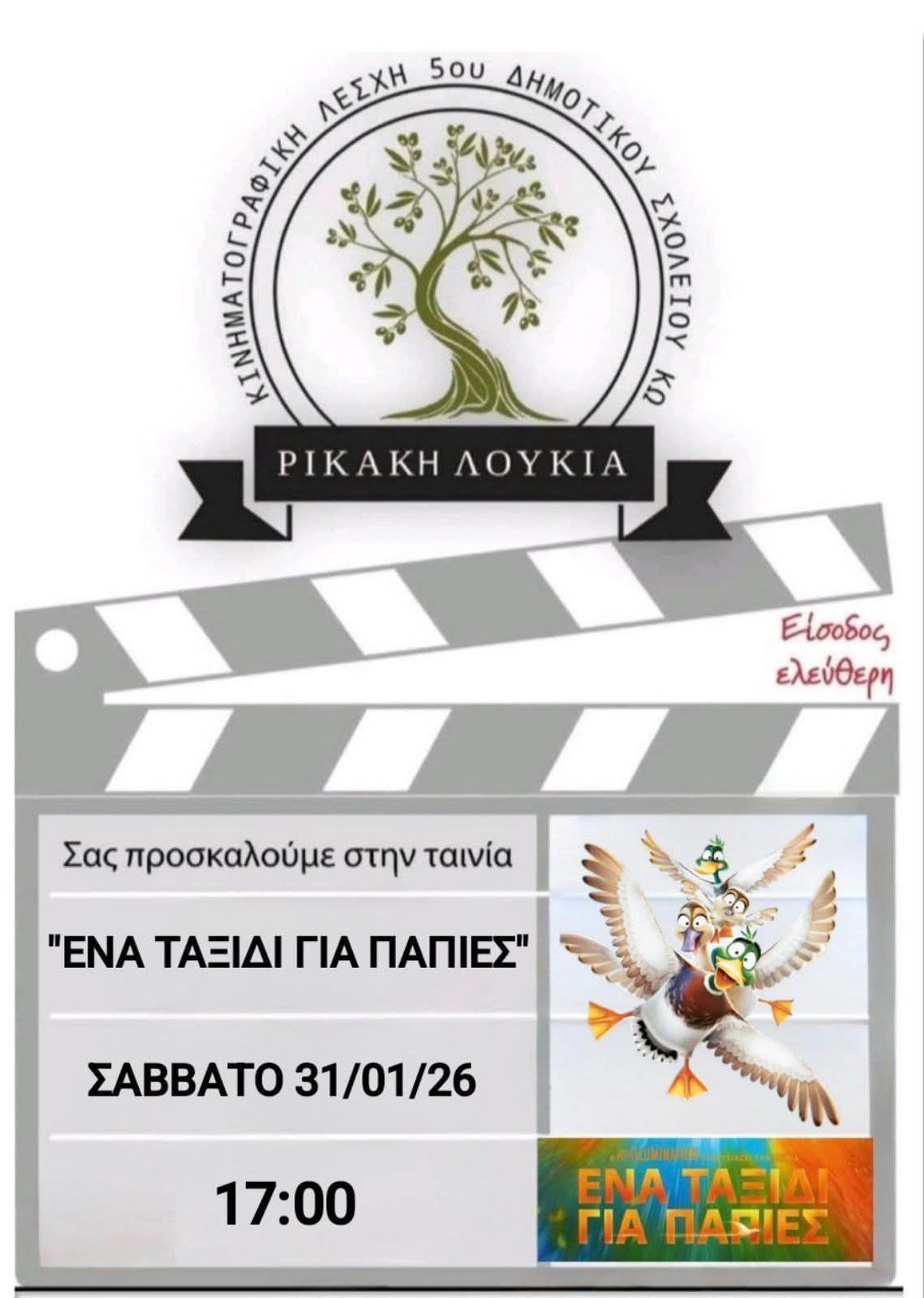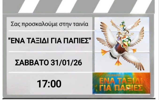 Το σχολείο μας σας προσκαλεί στην προβολή της ταινίας «Ένα Ταξίδι για Πάπιες», μιας όμορφης παιδικής ιστορίας για την οικογένεια, τη συνεργασία και το θάρρος να δοκιμάζουμε κάτι καινούριο.