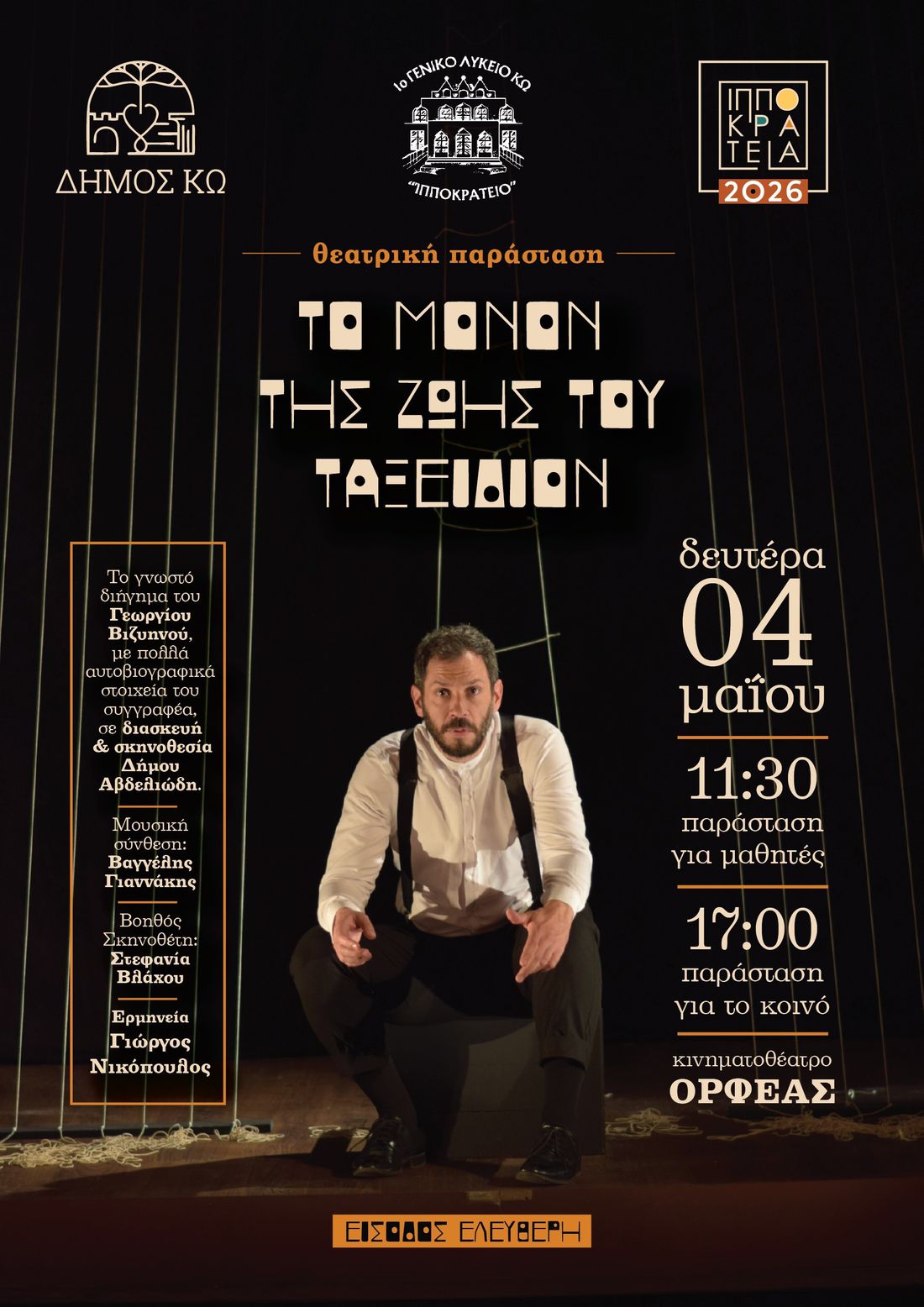 ΘΕΑΤΡΙΚΗ ΠΑΡΑΣΤΑΣΗ «ΤΟ ΜΟΝΟΝ ΤΗΣ ΖΩΗΣ ΤΟΥ ΤΑΞΕΙΔΙΟΝ» σε συνεργασία με το 1ο ΙΠΠΟΚΡΑΤΕΙΟ ΓΕΛ ΚΩ στο ΧΕΙΜΕΡΙΝΟ ΚΙΝΗΜΑΤΟΘΕΑΤΡΟ «ΟΡΦΕΑΣ» με ΕΙΣΟΔΟ ΕΛΕΥΘΕΡΗ